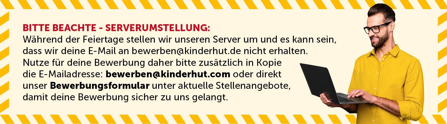 Wir freuen uns auf deine vollständige Bewerbung (Anschreiben, Lebenslauf und Zeugnisse) an unser Recruiting-Team über bewerben@kinderhut.de oder direkt per Klick: